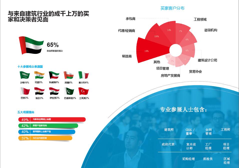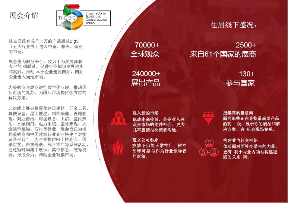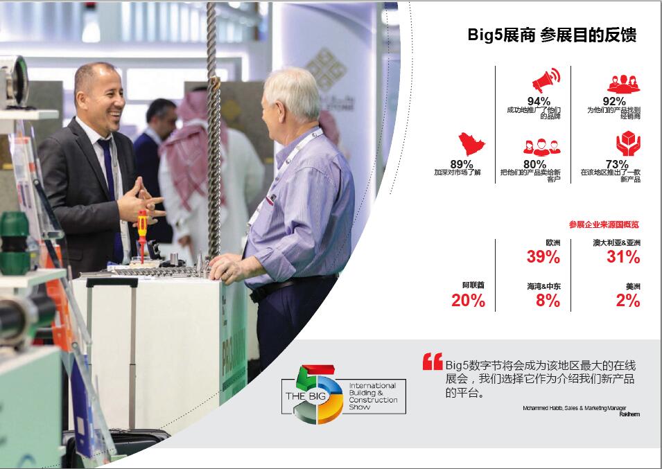 始辦于1980年的中東迪拜五大行業(yè)展(BIG5)是中東地區(qū)具影響力且是大型的建筑、建材及服務(wù)類展覽會(huì)。同時(shí)其衍生展中東五大行業(yè)建筑機(jī)械、車輛及設(shè)備展覽會(huì)(BIG5PMV)是專注于中東地區(qū)建筑設(shè)備、機(jī)械、工具和車輛的專業(yè)展會(huì)。如今,中東地區(qū)建筑市場(chǎng)的火暴和持續(xù)發(fā)展,帶動(dòng)了對(duì)建筑設(shè)備、材料、工程機(jī)械及車輛的強(qiáng)烈需求,更吸引了全球的關(guān)注。
