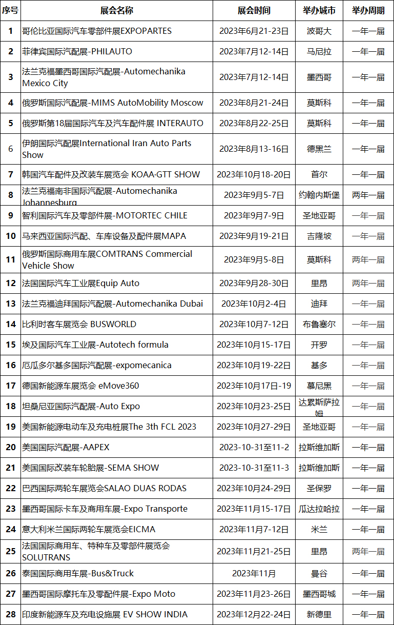 2023年全球國際汽配展會計劃表